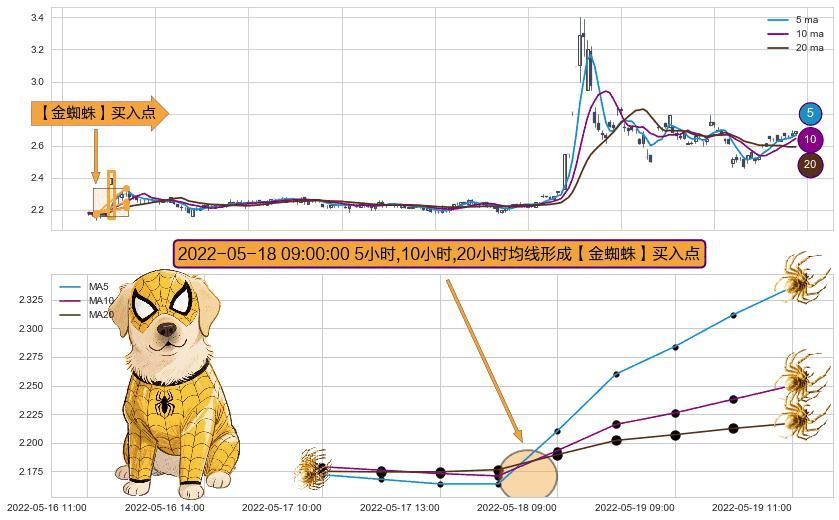 ⚀ 2022-05-18 09:00:00小时显现 5小时-10小时-20小时均线 【金蜘蛛】买入点 看多信号,后市看涨,买入