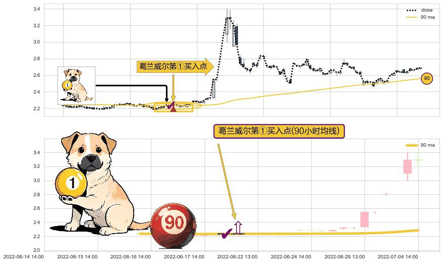 ⚀ 2022-06-21 13:00:00-小时显现 葛兰威尔均线 90小时均线 第买①入点 走势反转见底信号,后市看涨,买进信号