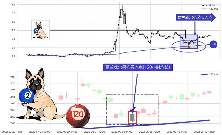 ⚀ 2022-08-03 14:00:00-小时显现 葛兰威尔均线 120小时均线 第②买入点 上升趋势的中继信号,后市看涨,买进信号