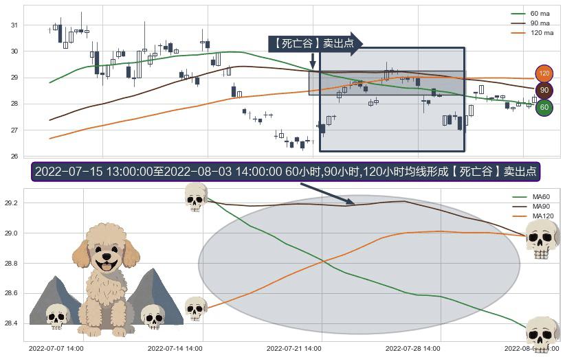 形态多维评估: ⚀ 2022-07-15 14:00:00-小时至2022-08-03 14:00:00-小时显现 60小时-90小时-120小时均线 【死亡谷】卖出点 看空信号,后市看跌,卖出