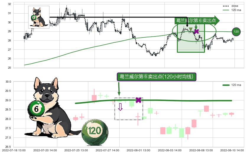 形态多维评估: ⚀ 2022-07-27 14:00:00-小时显现 葛兰威尔均线 120小时均线 第⑥卖出点 走势反转见顶信号,后市看跌,卖出信号