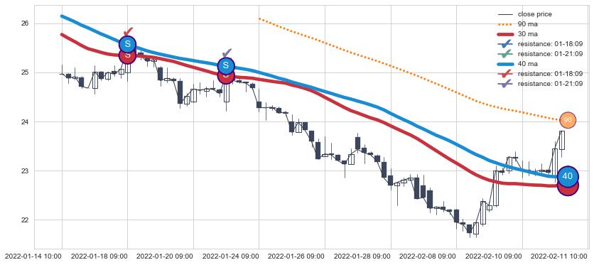 下跌趋势01-14 10:00-02-11 10:00,均线40, 30确认关键阻力2处