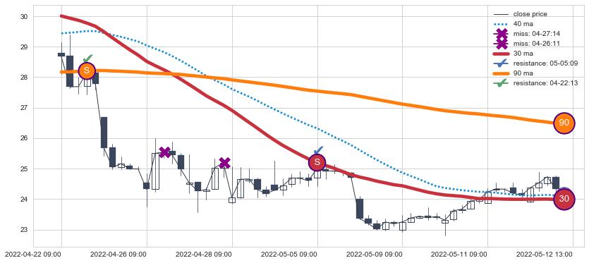 下跌趋势04-22 09:00-05-12 13:00,均线90, 30确认关键阻力2处
