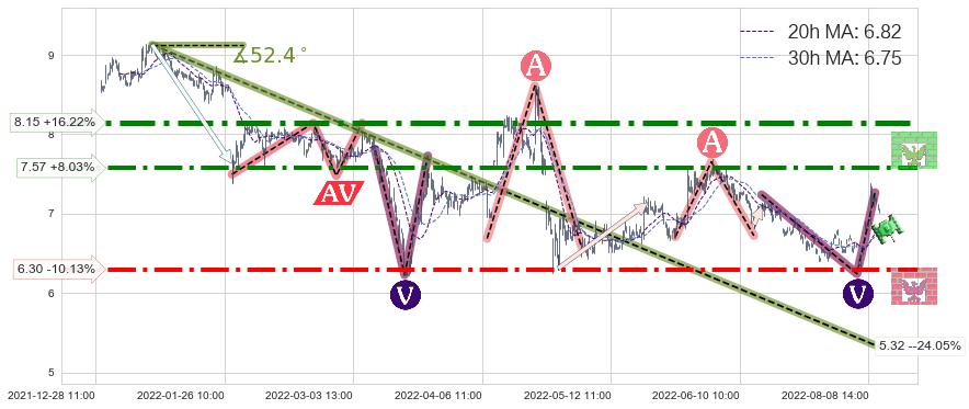 ♘ 阻力价格位7.57,可信任强度77.05%,距离最后交易2022-08-12 14:00形成的收盘价格7.01相差 +8.03%