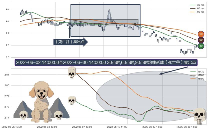 形态多维评估: ⚀ 2022-06-06 09:00:00-小时至2022-06-30 14:00:00-小时显现 30小时-60小时-90小时均线 【死亡谷】卖出点 看空信号,后市看跌,卖出
