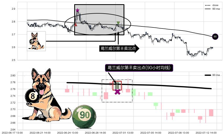 形态多维评估: ⚀ 2022-06-29 14:00:00-小时显现 葛兰威尔均线 90小时均线 第⑧卖出点 下降趋势的中继信号,后市看跌,卖出信号