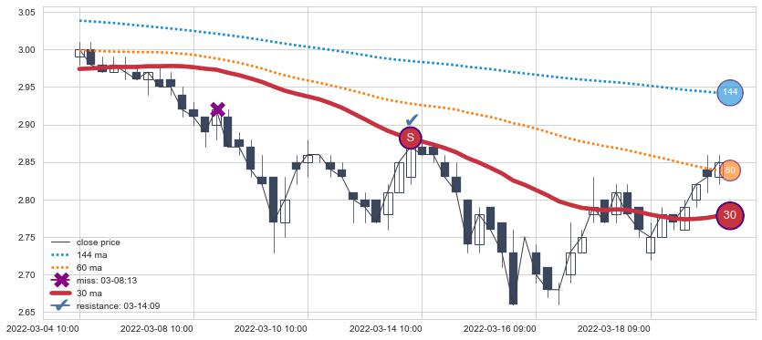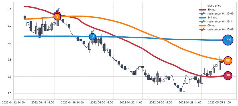 下跌趋势04-12 14:00-05-05 11:00,均线144, 60, 30确认关键阻力2处