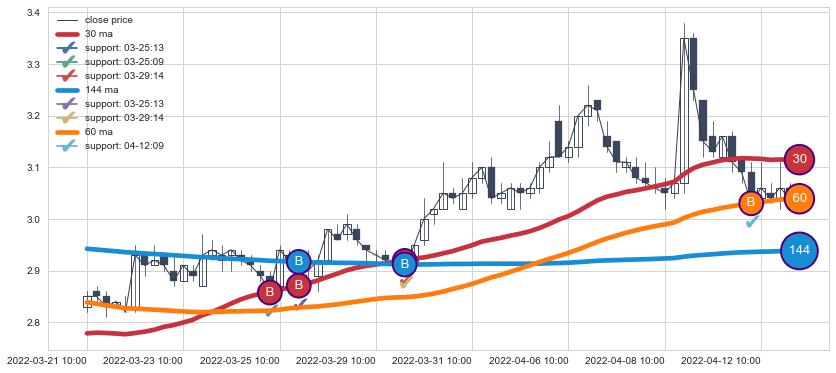 上涨趋势03-21 10:00-04-12 14:00,均线144, 60, 30确认关键支撑4处