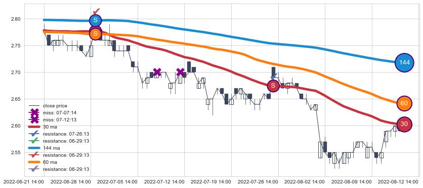 下跌趋势06-21 14:00-08-12 14:00,均线144, 60, 30确认关键阻力2处