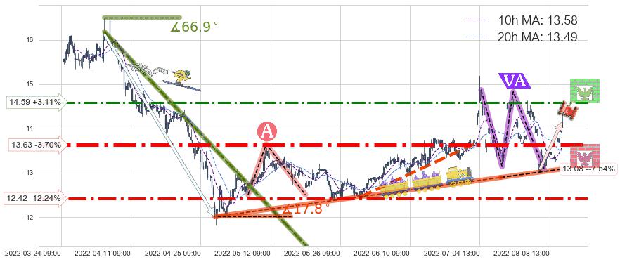 ♘ 阻力价格位14.59,可信任强度61.64%,距离最后交易2022-08-12 14:00形成的收盘价格14.15相差 +3.11%