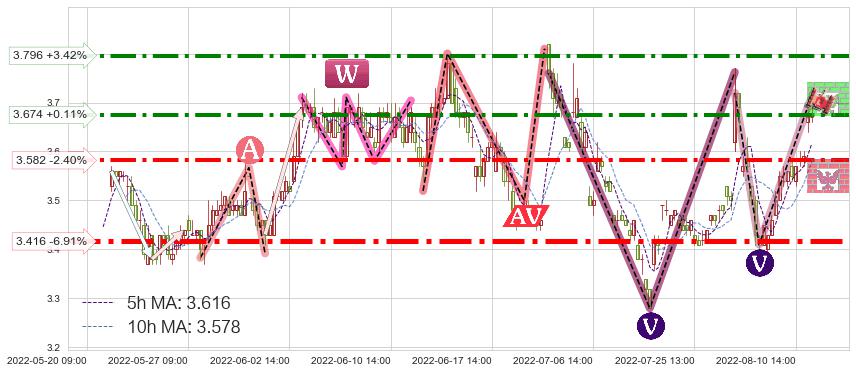 ♘ 阻力价格位3.674,可信任强度70.84%,距离最后交易2022-08-12 14:00形成的收盘价格3.670相差 +0.11%