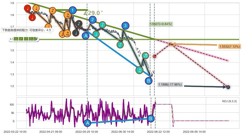 ♘ 在最后的下跌阶段2022-03-22 10:00至2022-08-11 13:00,存在 持续未破位的阻力位 ,阻力价格1.5927,可信任强度88.40%,其距离最后价格1.4500相差 +9.84%