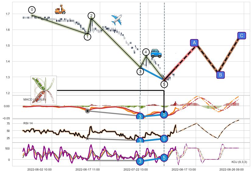➢ 1,3,5驱动浪MACD, RSI, KDJ走势都出现【常规背离】反转信号增强