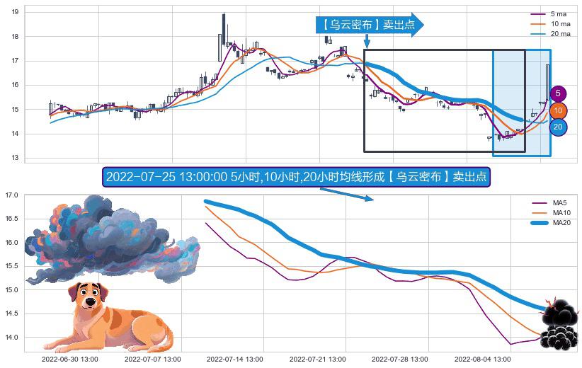 形态多维评估: ⚀ 2022-07-08 14:00:00小时-2022-08-08 14:00:00小时显现 5小时-10小时-20小时均线 【乌云密布】卖出点 看空信号,后市看跌,卖出
