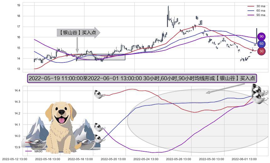 形态多维评估: ⚀ 2022-05-19 13:00:00-小时至2022-06-01 13:00:00-小时显现 30小时-60小时-90小时均线 【银山谷】买入点 看多信号,后市看涨,买入