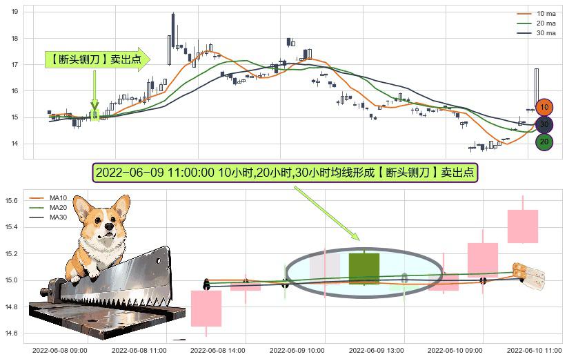 形态多维评估: ⚀ 2022-06-09 11:00:00小时显现 10小时-20小时-30小时均线 【断头铡刀】卖出点 看空信号,后市看跌,卖出