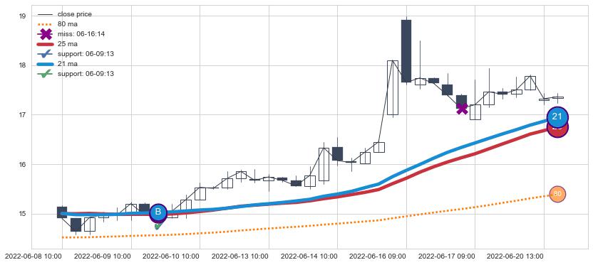 上涨趋势06-08 10:00-06-20 14:00,均线25, 21确认关键支撑1处