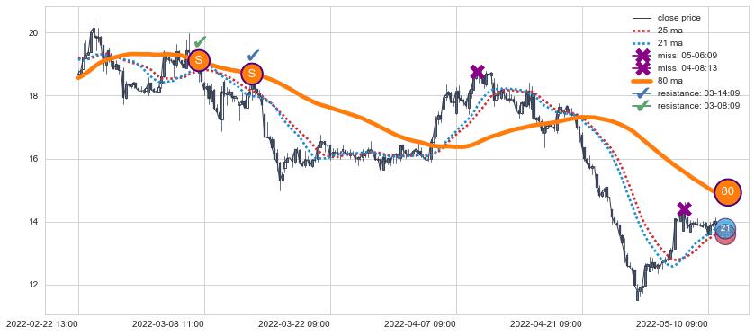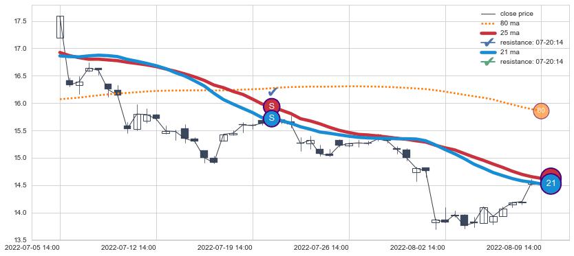 下跌趋势02-22 13:00-05-10 13:00,均线80确认关键阻力2处