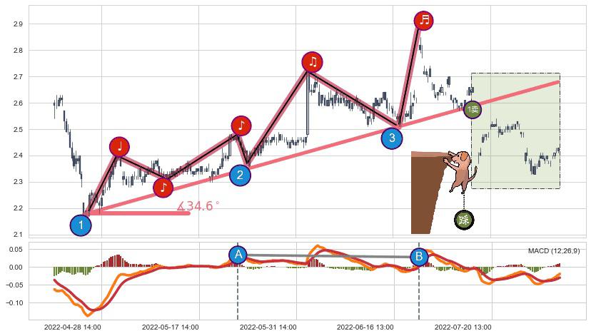✂️ 2022-04-27 09:00-2022-07-15 13:00上升趋势存在反转[风险],其原上升趋势的支撑位(2.679)已破位[强阻力信号],原上升趋势角度: 34.6˚