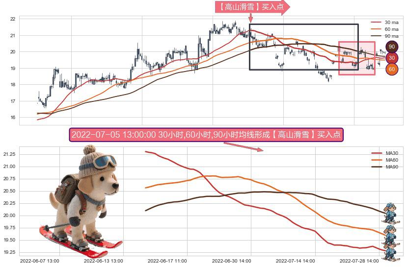⚀ 2022-06-15 09:00:00小时-2022-07-29 14:00:00小时显现 30小时-60小时-90小时均线 【高山滑雪】买入点 看多信号,后市看涨,买入