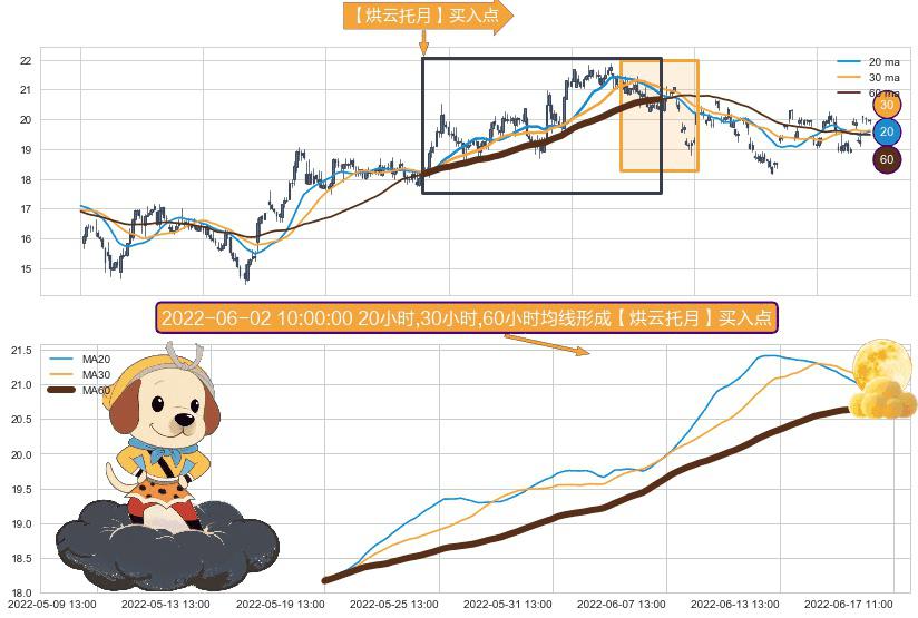 ⚀ 2022-05-19 13:00:00小时-2022-06-16 14:00:00小时显现 20小时-30小时-60小时均线 【烘云托月】买入点 看多信号,后市看涨,买入