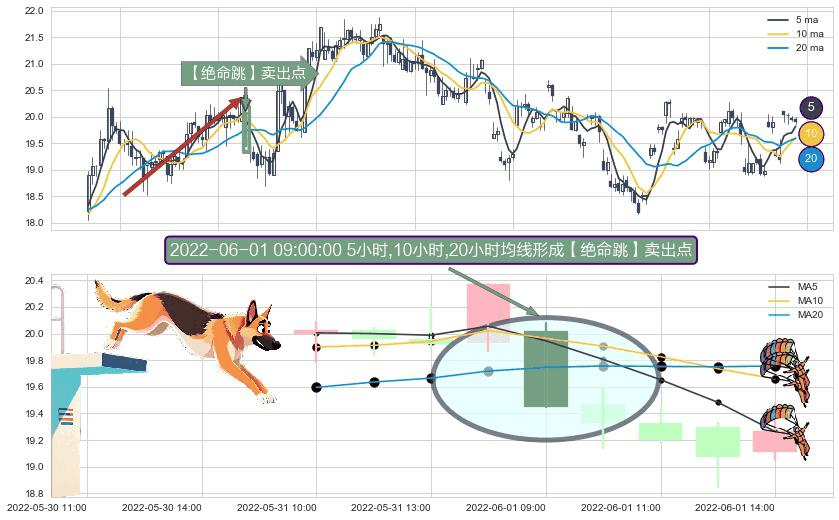 ⚀ 2022-06-01 09:00:00小时显现 5小时-10小时-20小时均线 【绝命跳】卖出点 看空信号,后市看跌,卖出