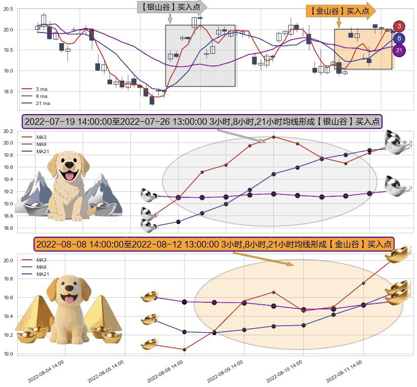 ⚄ 2022-08-09 13:00:00-小时至2022-08-12 13:00:00-小时显现 3小时-8小时-21小时均线 【金山谷】买入点 其再次确认了买入信号,可靠性更强,买入