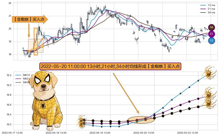 ⚀ 2022-05-20 11:00:00小时显现 13小时-21小时-34小时均线 【金蜘蛛】买入点 看多信号,后市看涨,买入