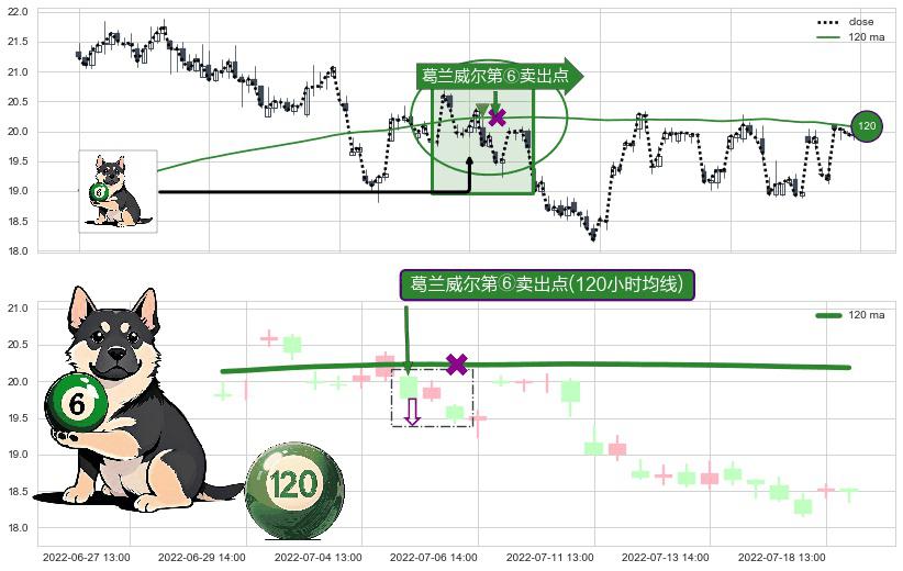 ⚀ 2022-07-05 13:00:00-小时显现 葛兰威尔均线 120小时均线 第⑥卖出点 走势反转见顶信号,后市看跌,卖出信号