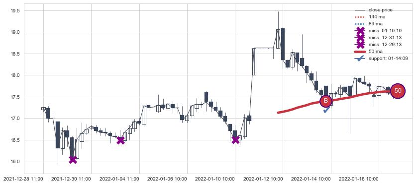 ⚅ 卖点向下突破均线后,价格走势有持续向下的迹象,但动能稍显不足,迟迟不能远离均线