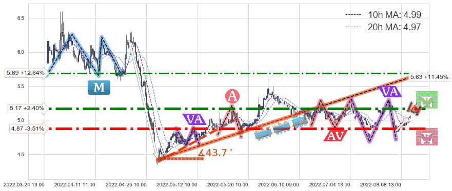 ♘ 阻力价格位5.17,可信任强度87.67%,距离最后交易2022-08-12 14:00形成的收盘价格5.05相差 +2.40%