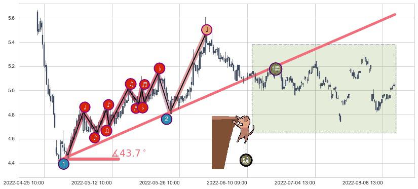从2022-06-14 11:00至2022-07-04 14:00,共包含40个小时,阶段股价上涨4.40%,阶段股价变动位移路程比: 1 : 5