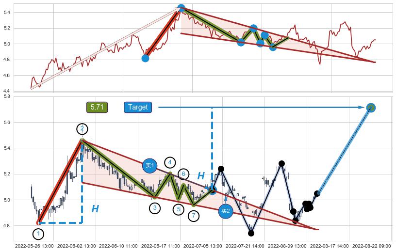 ➢ 最小中继整理涨幅→𝐇: 0.6400 (𝐇楔型旗杆的长度:楔型起点→顶点)