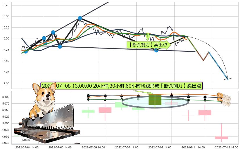 | 5 🅚:【断头铡刀】卖出点 ➕ 📈:趋势线上涨趋势原支撑已出现破位,猜想原支撑已变为阻力位(大周期均值回复) ☞ 看空信号 ⇥ 【均线】交织【图形】⇥ 综合量化分数: 45 | > |