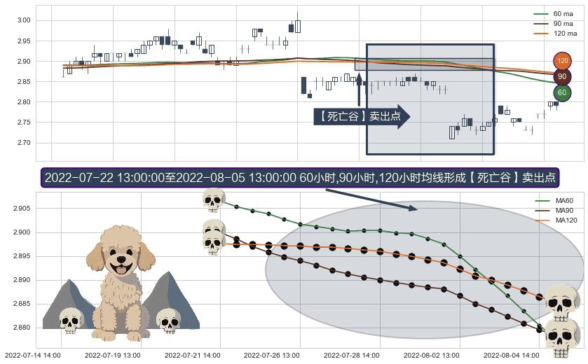 ⚀ 2022-07-22 14:00:00-小时至2022-08-05 13:00:00-小时显现 60小时-90小时-120小时均线 【死亡谷】卖出点 看空信号,后市看跌,卖出