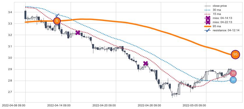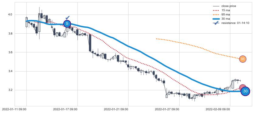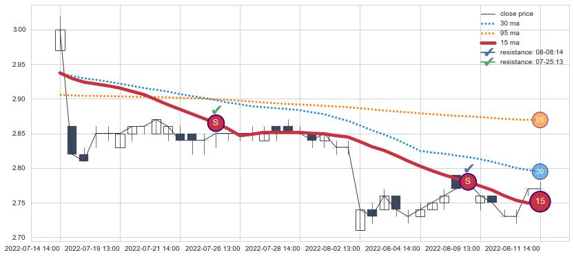 ⚂ 2022-06-27 14:00:00-小时均线向上突破,2022-07-15 13:00:00-小时重新下穿均线破位,均线阻力再次生效