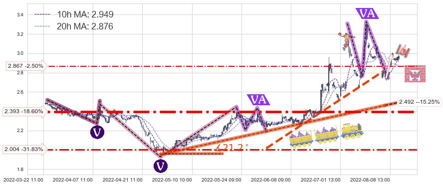 ♘ 支撑价格位2.867,可信任强度39.95%,距离最后交易2022-08-12 14:00形成的收盘价格2.940相差 -2.50%