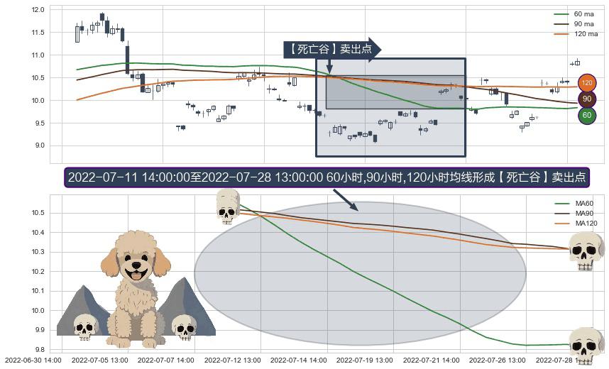 形态多维评估: ⚀ 2022-07-12 13:00:00-小时至2022-07-28 13:00:00-小时显现 60小时-90小时-120小时均线 【死亡谷】卖出点 看空信号,后市看跌,卖出