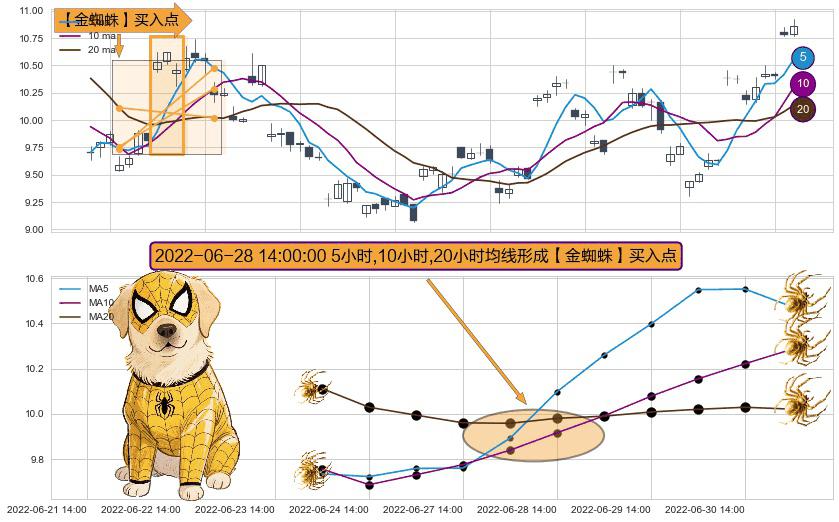 形态多维评估: ⚀ 2022-06-28 14:00:00小时显现 5小时-10小时-20小时均线 【金蜘蛛】买入点 看多信号,后市看涨,买入