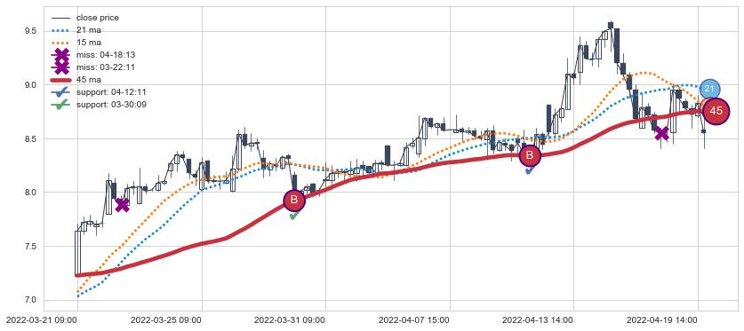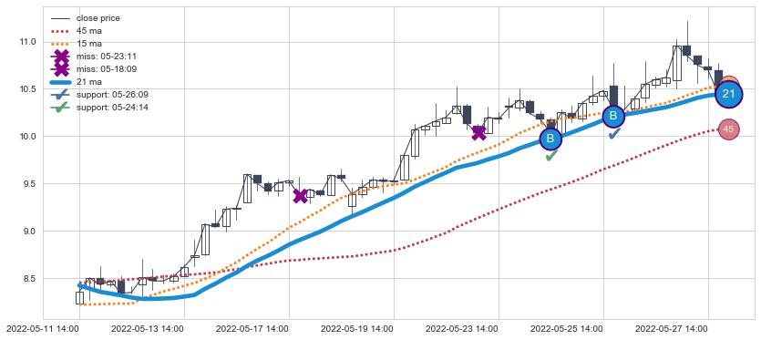 上涨趋势05-11 14:00-05-30 09:00,均线21确认关键支撑2处