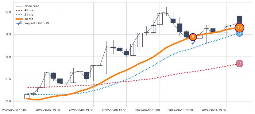 上涨趋势06-06 13:00-06-15 09:00,均线15确认关键支撑1处