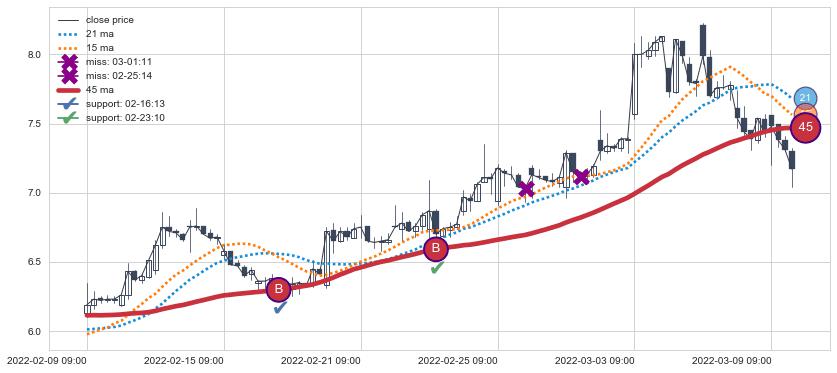 上涨趋势03-21 09:00-04-20 09:00,均线45确认关键支撑2处
