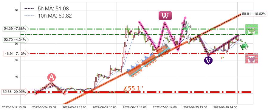 ♘ 阻力价格位54.39,可信任强度56.20%,距离最后交易2022-08-12 14:00形成的收盘价格50.51相差 +7.68%