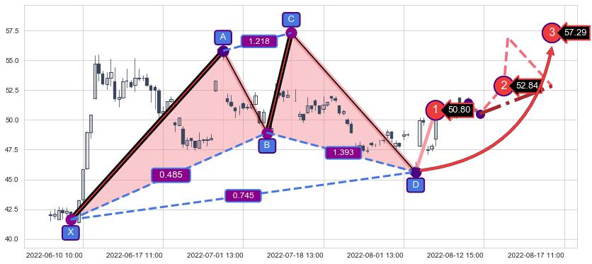 ➢ 距离预测D点位置有足够的下跌空间, 与看涨【伽利】形态相反,实际方向【看跌】