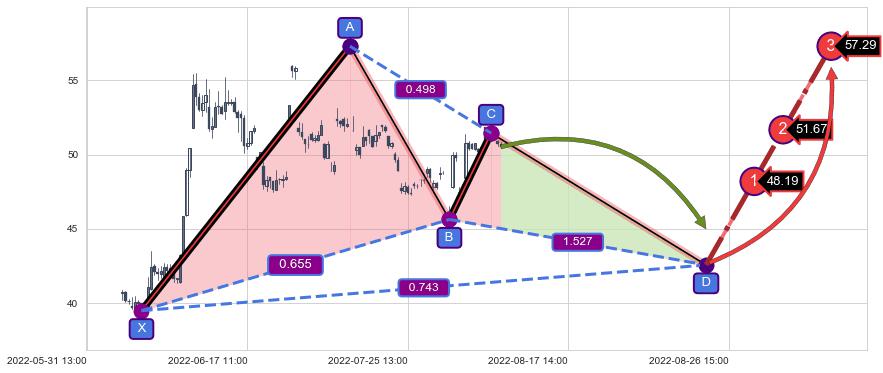 | 6 🅚:【旱地拔葱】买入点 ➕ 📡:谐波赛福已到达d点:猜想c下行到达d点后报复性拉升上涨(均值回复) ☞ 看多信号 ⇥ 【均线】交织【图形】⇥ 综合量化分数: 61 | > |