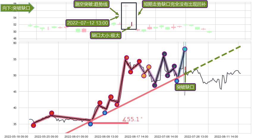 从2022-05-19 09:00至2022-07-13 13:00,共包含128个小时,阶段股价上涨40.15%,阶段股价变动位移路程比: 1 : 4,上涨趋势角度: 55.1,2022-07-11 13:00向⇪形成缺口,跳空上涨+10.00%