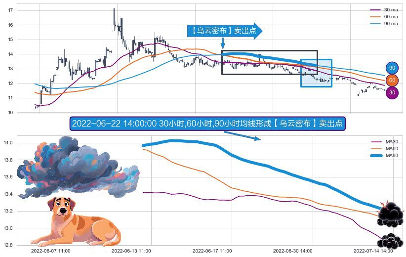 ⚀ 2022-06-13 09:00:00小时-2022-07-13 14:00:00小时显现 30小时-60小时-90小时均线 【乌云密布】卖出点 看空信号,后市看跌,卖出