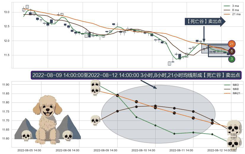 ⚀ 2022-08-10 13:00:00-小时至2022-08-12 14:00:00-小时显现 3小时-8小时-21小时均线 【死亡谷】卖出点 看空信号,后市看跌,卖出