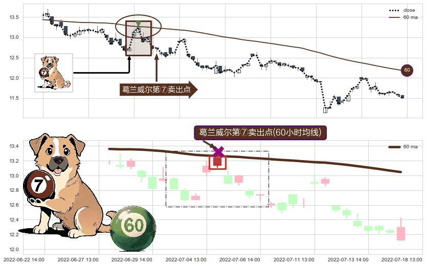 ⚀ 2022-07-04 14:00:00-小时显现 葛兰威尔均线 60小时均线 第⑦卖出点 下降趋势的中继信号,后市看跌,卖出信号
