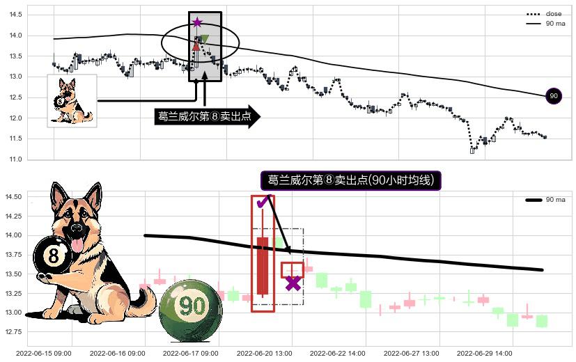 ⚀ 2022-06-20 13:00:00-小时显现 葛兰威尔均线 90小时均线 第⑧卖出点 下降趋势的中继信号,后市看跌,卖出信号